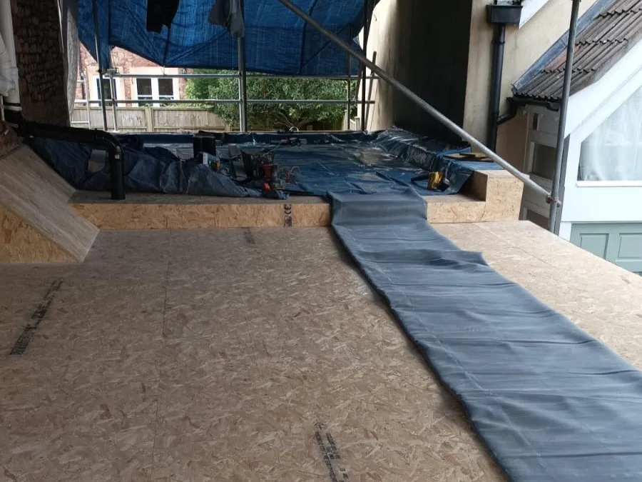 Before installing the EPDM membrane, the roof surface was fully prepared to provide a clean, level and secure base. With the OSB board in place and the membrane positioned ready for fitting, this stage helped ensure a smooth installation and a durable waterproof finish.
